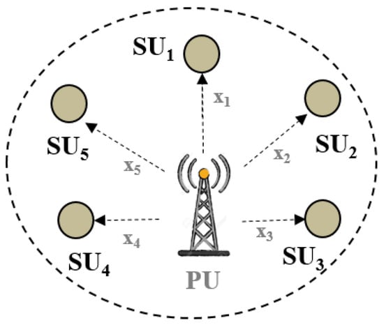 where N is the number of samples, xi(n) is the ith SU received signal, s(n) presents the PU signal, and wi(n) is the additive white Gaussian noise (AWGN) with zero mean and variance δw. H0 and H1 denote respectively the absence and the presence of the PU signal. Figure 3 shows an example of the cooperative sensing network.