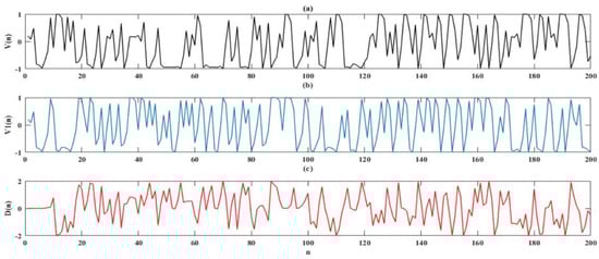Example of Chebyshev sequence, using different initial value and fixed bifurcation parameter: (a) the Chebyshev sequence using initial condition (V0) = 0.2, (b) the Chebyshev sequence using V0 = 0.200001, and (c) the difference between the first and the second sequence.
