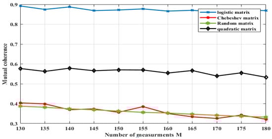 where ε is the restricted isometry constant of the sensing matrix C, is the l2-norm, and x is the received sparse signal. Random sensing matrices have been confirmed to satisfy the RIP with high probability [50]. For the coherence criterion, it evaluates the sensing matrix quality and its efficacy. The mutual coherence of a matrix is denoted as μ(C), which measures the maximal value of correlation between the columns of C. It is defined as follows: