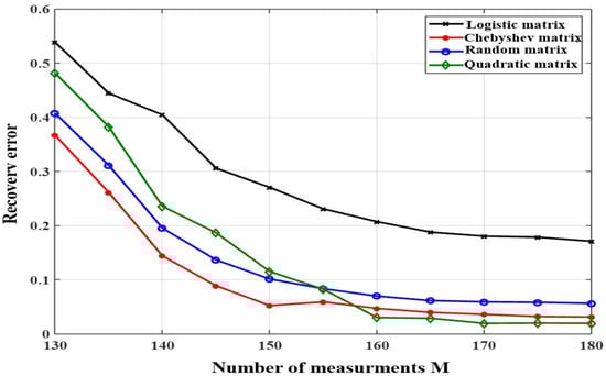 Comparison of recovery error metric for multiple value of compressive measurements, M, for Logistic, Chebyshev, quadratic, and random sensing matrices.