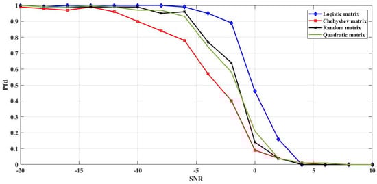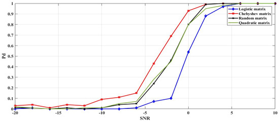 Probability of detection as a function of SNR for Logistic, Chebyshev, quadratic, and random sensing matrices with probability for false alarm (Pfa) of 0.01.