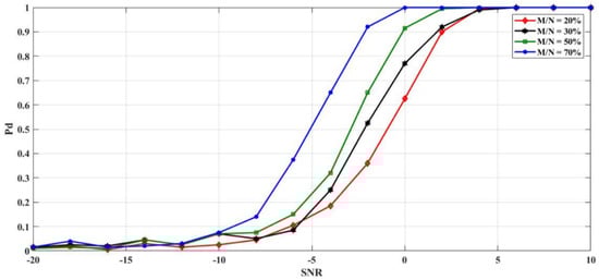 Probability of detection as a function of SNR for compressive spectrum sensing based on Chebyshev matrix for different values of the compression ratio, M/N = 20%, 30%, 50%, and 70%.