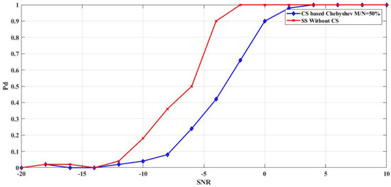 Figure 14 shows the probability of detection as a function of the SNR for two techniques: chaotic CSS and normal sensing without compressive sensing. As shown in the figure, for probability of false alarm Pfa = 0.01 the probability of detection growths as the SNR increase for both techniques, the proposed model and the normal sensing. It can also be noted that the probability of detection without compressive sensing reaches 100% for SNR= −2 dB, while the probability of detection of our proposed model with a compression ratio M/N = 50% achieves 100 % for SNR = 2 dB. It means that, with a smaller number of measurements, we can still maintain appropriate detection performance close to the normal sensing.