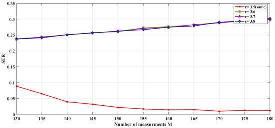 In Figure 16, the same test is executed, but this time the bifurcation parameter, r, is modified. The transmitter uses r = 3.5 to generate the Chebyshev chaotic matrix, and we evaluate the system performance of four receivers, using r = 3.5, 3.6, 3.7, and 3.8. As expected, only users that use the same bifurcation parameter at the reconstruction process are able to recover the signal with a low error rate. Thus, the proposed system is very sensitive to both the initial value and bifurcation parameter.