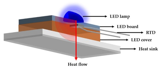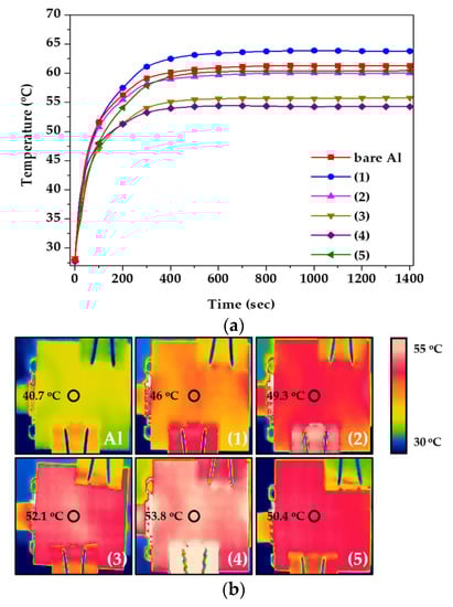 Finally, the heat dissipation performance was evaluated via practical application, and the results are shown in Figure 8. An LED module was applied for the test, and the temperature of the RTD and the surface of the heat sink was evaluated, as shown in Figure 1. Figure 8a measured the temperature between LED and heat sink, and Figure 8b was the temperature of the heat sink surface. Therefore, as more heat was transferred to the outside through the heat sink, the temperature between LED and heat sink decreased and the surface temperature increased. The RTD temperature was measured in real time until the temperature was stabilized for 1400 s. When the tin-sulfuric acid was applied to the heat sink, it had the lowest temperature value compared to the other specimens (Figure 8a), and the surface temperature had the highest value (Figure 8b). These results indicate that the movement of heat from the inside to the outside was faster than that of other LED modules because of the improvement of the heat dissipation performance, suggesting that a large amount of heat was concentrated in the heat sink and dissipated [25,26]. From a long-term perspective, the lifetime of the LED could be extended when using a tin-sulfuric acid heat sink.
