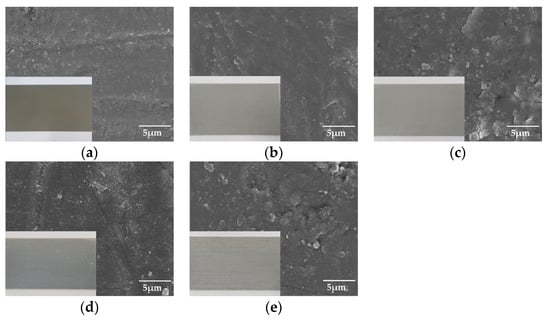Figure 2 shows the surface morphology of the anodized specimens, determined using FE-SEM. Note that the optical images are included to observe the color of the surfaces in the FE-SEM images. The samples under all conditions can be seen to have a relatively uniform sealing process. In addition, in the case of aluminum anodizing, the color of the surface commonly does not change before and after the anodizing treatment. However, sample (1) demonstrated coloration because of increasing internal defects, such as pores, cracks, and mis-orientations [13].