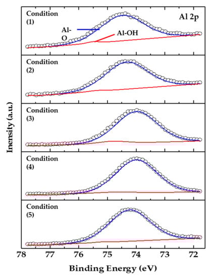XPS spectra of Al 2p core lever as a function of process conditions (1)–(5).