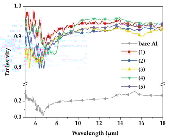 Emissivity of samples measured at wavelengths of 5 to 20 μm using FT-IR spectroscopy.