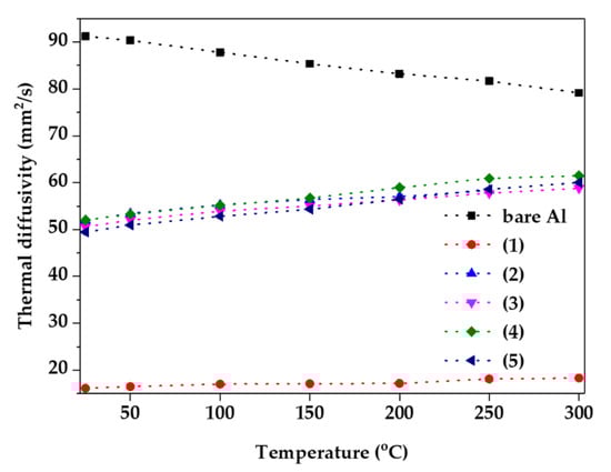 In addition, thermal diffusivity was examined using laser flash analysis from room temperature to 300 °C, as shown in Figure 5. Because the thermal diffusivity is closely related to the thermal conductivity of the materials, it is common to have a high value in metallic materials, such as bare Al. However, the thermal diffusivity decreases with the increasing temperature because of the increased thermal resistance and reduced binding energy due to the vibration of metal atoms [23]. In addition, because ceramic as oxide materials have a higher binding energy and heat capacity than metallic materials, they have the opposite tendency of metallic materials [24]. If the binding energy and heat capacity are high, a large amount of heat can be removed from the metallic materials, and the heat dissipation effect is maximized. With the exception of condition (1), the thermal diffusivity increases as the temperature increases, close to that of the bare Al. However, the sample of condition (1) had low thermal diffusivity, which can be inferred from an internal defect, which is equivalent to Figure 2a [13].