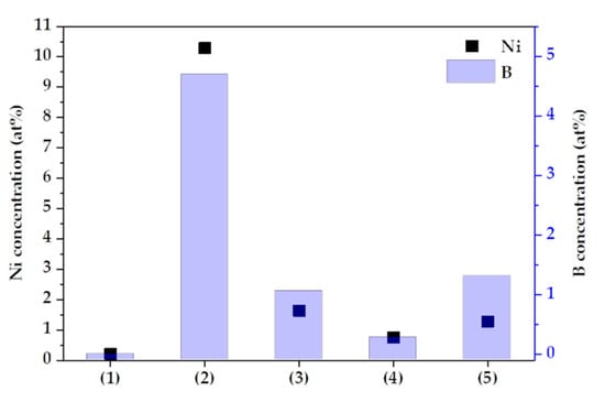 In addition, a sealing treatment using Ni and B ions was performed to obtain equivalent results under all conditions, and the concentrations of Ni and B varied depending on the conditions, as shown in Figure 6. This is because the pore morphology of the oxide layer formed by anodizing was different. A closed anodized layer was generated under condition (1), and the sealing electrolyte was not detected by XPS. However, pores were formed and filled by Ni and B ions, in the other conditions. The sample of condition (4) formed a dense oxide layer and condition (2) formed a thin oxide layer.