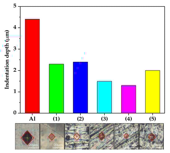 The results of the hardness test are shown in Figure 7 as a function of anodizing conditions and indicate the density of the oxide layers. The density of the oxide layer can also be determined by the depth of the pressed materials because it was indented with a force that did not affect the substrate. An indenter (a diamond for the Vickers hardness test) was inserted into each sample with equal force, and the hardness was calculated via the size of the indentation on the surface. The specific values are listed in Table 3. When condition (4) was used, the hardness was higher than that in all other conditions. That is, the sample of condition (4) had the highest density oxide layer according to the concentration of Ni and B ions (by XPS) and the hardness test, as shown in Figure 6 and Figure 7, respectively. The oxide layer formed through anodizing has a large number of pores, which works as a thermal barrier. The pores were filled by the sealing electrolyte, but no wonder it was less robust than the oxide layer formed by chemical bonds with the substrate. The dense oxide layer means that it contains fewer pores and can be concluded that fewer factors are preventing thermal transfer. In layers composed of same components, it can be a reasonable inference that high hardness samples have high thermal transfer properties.
