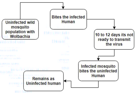 A novel Aedes Aegypti suppression technique using the life-shortening bacterium Wolbachia plays an important role [,,]. It is an endosymbiotic bacterium that is reported in nearly 60 percent of insect species by Wolbach (1924) []. The World Mosquito Program (WMP) [] from Australia currently release Wolbachia infected mosquitoes over 10 countries, such as countries in Latin America, India, Sri Lanka, Vietnam, Indonesia and cities in Oceania. In that research, they found that Wolbachia is a self-sustaining bacterium and in the presence of Wolbachia infected mosquitoes there is zero possibility of having Dengue. The Wolbachia releasing strategy is more powerful than that of the above-mentioned control strategies in the sense that it is self-sustaining, affordable, only needs a small amount of release, the area covered is larger than the released area, and the most important thing is it is not harmful to human health. The authors of [,,,] discussed that Wolbachia can restrict the virus particles of various diseases. We know that the virus is transmitted from infected humans to uninfected humans via female mosquitoes. Meanwhile, if a virus-infected mosquito carries Wolbachia strain, then the virus cannot be transmitted to an uninfected human. Because this Wolbachia strain blocks the virus particles inside the salivary gland of mosquitoes (Ref. Figure 1).