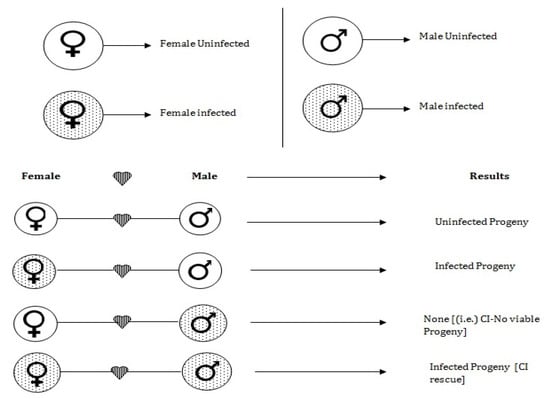 - Introgression: In this process, the Wolbachia strains are carried out to next generation through mating. If Wolbachia infected female mated with Wolbachia infected or uninfected male, then the produced offsprings have the Wolbachia strain (Called CI rescue). Suppose the Wolbachia uninfected female mated with a Wolbachia infected male then there is no viable progeny. Finally, if a non-Wolbachia female mated with a non-Wolbachia male then there is no Wolbachia infection in the offspring.