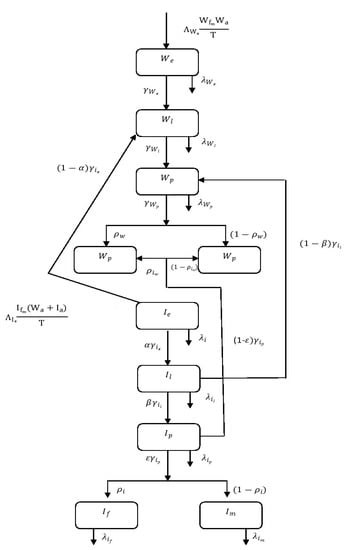 In this section, a novel mathematical model is proposed to expose the transmission dynamics of the gram negative bacteria Wolbachia among Aedes Aegypti mosquitoes. While constructing the model we have considered the total of 10 stages such as non-Wolbachia eggs , non-Wolbachia larvae , non-Wolbachia pupae , non-Wolbachia adult female , non-Wolbachia adult male , Wolbachia infected eggs , Wolbachia infected larvae , Wolbachia infected pupae , Wolbachia infected adult female , Wolbachia infected adult male . The total population at time t is denoted as . The eggs with zero Wolbachia infection are produced at the rate by the mating process between non-Wolbachia female and non-Wolbachia male . There is no other possibilities of having a non-Wolbachia eggs. Therefore, the reproduction rate of non-Wolbachia mosquitoes can be calculated by the term . Along with this, the terms (natural mortality rate of non-Wolbachia eggs) and (maturation rate of non-Wolbachia eggs) denotes the limitations in the growth of wild mosquito eggs. At the same time, after release of Wolbachia infected mosquitoes (in both aquatic and ariel stage) in a common environment, the production of Wolbachia infected mosquito eggs , depends on mating between Wolbachia infected female and non-Wolbachia male and from mating between Wolbachia infected female and Wolbachia infected male . Through this, the birth rate of Wolbachia infected mosquito eggs population with the reproduction rate is