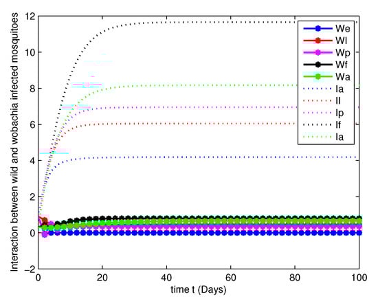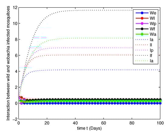 Appendix A.3. Both Wolbachia and Non-Wolbachia Mosquitoes Co-Existence Equilibrium