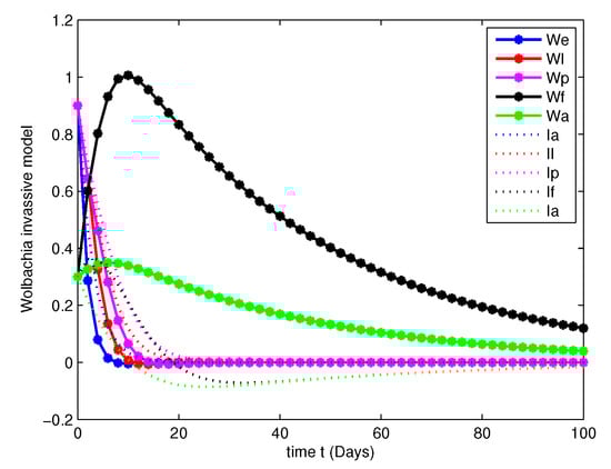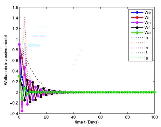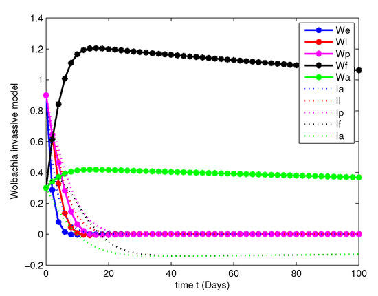- Adekunle, A.I.; Michael, M.T.; McBryde, E.S. Mathematical analysis of a Wolbachia invasive model with imperfect maternal transmission and loss of Wolbachia infection. Infect. Dis. Model. 2019, 4, 265–285. [Google Scholar] [CrossRef]