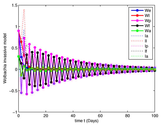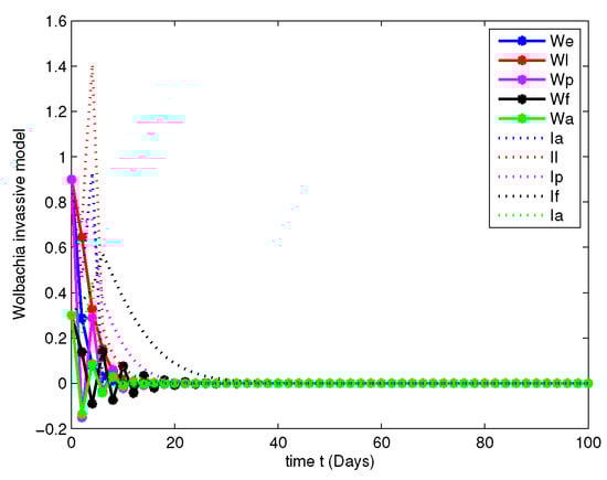 Furthermore, some existing mathematical models consider Wolbachia as a control agent for mosquito-borne diseases. In [], the author proposed a deterministic model to control mosquito-borne diseases up to 90% via Wolbachia spread, also the author considered both human and mosquito populations to create a mathematical model. In [,], the authors proposed a mathematical model depicting the life stages of mosquitoes with Wolbachia and proved that Wolbachia has an excellent quality to control dengue virus spread. In [], the authors analyzed the integer ordered mathematical model consisting of only four stages (aquatic stage with and without Wolbachia and adult female mosquitoes with and without Wolbachia), which considered the imperfect maternal transmission and Wolbachia invasion. In [], the two sex mathematical model is discussed to analyze the persistence of Wolbachia. In [], the age and bite structured mathematical model is proposed and performed the mathematical analysis. In [], the authors discussed the linear feedback control strategy of a mathematical model containing only three stages such as aquatic, female Wolbachia infected and uninfected mosquitoes. In this, the author analyzed the Wolbachia infected mosquitoes release into the seasonal environment. In [], the authors presented a mathematical model to depict the mechanism of the virus inside both humans and mosquitoes. In this work, the author utilized two various types of controls like vaccination for humans and Wolbachia infected mosquitoes’ release for mosquitoes. The pontriyagin maximum principle was utilized to analyze the optimal control of the proposed mathematical model. In [], the authors discussed the Wolbachia infection among Aedes Aegypti mosquitoes via delay differential equations. In that work, the author proposed the delay dependent stability criteria of the proposed model by utilizing the results from spectrum analysis. In [], the authors proposed an age structured fractional order mathematical model to control the Aedes Aegypti mosquitoes via Wolbachia bacterium using the Linear Matrix Inequality (LMI) approach.