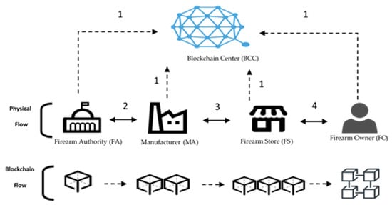 On the other hand, blockchain technology, with a unique combination of features such as distributed notes, decentralized structure, consensus algorithm, storage mechanism, asymmetric encryption, and smart contract, ensures network visibility, transparency, and security. Blockchain has immense potential to transform supply chain (SC) functions, from SC provenance to business process reengineering and security enhancement []. It is better to involve the management of the firearm supply chain. For these reasons, we combine blockchain and RFID technology to propose a firearm tracking system such that the information cannot be modified and tampered with once the data are uploaded to the blockchain center. This information is transparent and traceable for people to verify.