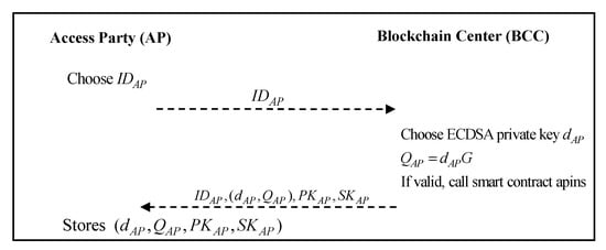 The FA, MA, FS, and FO should register with the blockchain center and obtain a relative public/private key pair. The access party (AP) can represent the FA, MA, FS, and FO. Figure 2 shows the flowchart of the registration phase.