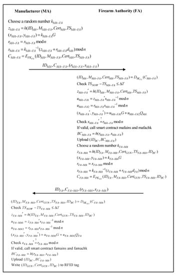 The MA that calculates , is also uploaded to the blockchain center. The MA produces firearms and is written to the RFID tag.