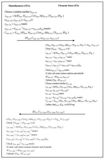 In addition to involving RFID technology [] to facilitate firearm logistics management, we also use blockchain technology to fulfill decentralization, transparency, public verification, trustless, non-tamperproof, and irreversibility characteristics. Secondly, it is worth mentioning that a smart contract is a special agreement used through a contract in the blockchain, which is mainly used to provide verification and execution of conditions set within the smart contract []. Firearm transactions should be traceable, difficult to tamper with, and irreversible. Therefore, smart contracts can conduct secure transactions without a third party. All messages related to the terms of the contract in the transaction are automatically executed under the operations set in the contract to reduce the need for trusted arbitrations, intermediates, fraud losses, and enforcement costs, as well as reduce accidental exceptions and malicious acts, in our scheme. Therefore, to implement a secure communication environment in a traceable firearm system based on blockchain, the proposed scheme needs to satisfy the following security requirements: