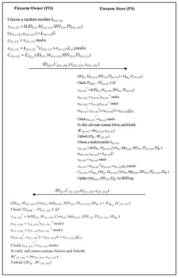 Through Equations (38), (40), (46) and (48), it can be proven that, in the proposed scheme, the firearm owner FO and the firearm store FS authenticate each other. Moreover, it can also be proven that the proposed scheme can authenticate the private key of the firearm owner FO and the firearm store FS.