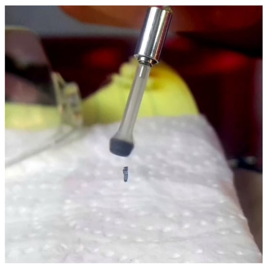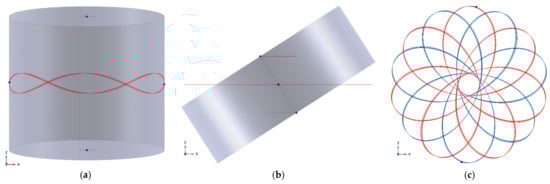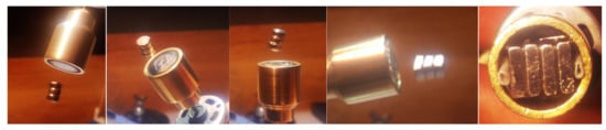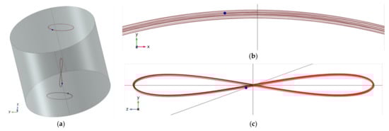 Simulations of motion a cylindrical body having a dipole moment in its axial direction subject a rotating field BC around axis-z and orthogonal to it with constant velocity equal to 60 π rAd/S And wITh constant magnitude. A static field BS in z direction having strength of 0.18 BC IS AlSo preSenT. Torque figures Are τC = ||BC||·||m|| = 1.2 × 10−3 Nm, τS = 0.18 τC. This ratio is slightly above the required ratio 0.174 to obtain conical motion with fixed zenith angle according to Equation (51). Initial condition are given in order to obtain a smooth conical motion, but not finely tuned. Angle φ set initially to 0.3455 rad and kept almost constant. As a result, body’s main axis draws conical circular motions around axis-z with zenith angle φ = 0.345. Body dimensions are chosen in order to obtain principal moments are inertia are equal to 1 × 10−7 Nm2 (0.999 × 10−7 Nm2 used by simulation) has MoI equal to 1 × 10−7 kg m2 on all its principal axes. Its mass is 6.68 g, radius is 5.4711 mm, height is 9.4763 mm and has uniform density of 7.5 g/cm3. Angular velocity of the applied torque is 60 π = 188.5 rad/s. Left figure shows an instance of the body with traces of top and bottom center points (1, 2) and middle side point (3) of the body. Trace 3 have ‘eight’ shape because presence of angular motion second harmonic in z direction in accordance of Equation (65). Right figures show zoomed view of traces where the top figure corresponds to the arc from the circular trace of top point projected on xy plane at instance T = 0.767 ms where the motion completes its 23rd cycle. Bottom figure similarly shows the rotated ‘eight’ figure on zy plane. Vertical and horizontal hairlines in this figure are z and y axes and the diagonal is the main axis of the cylinder.