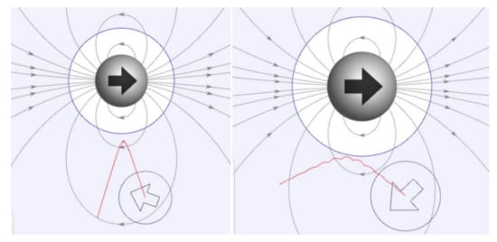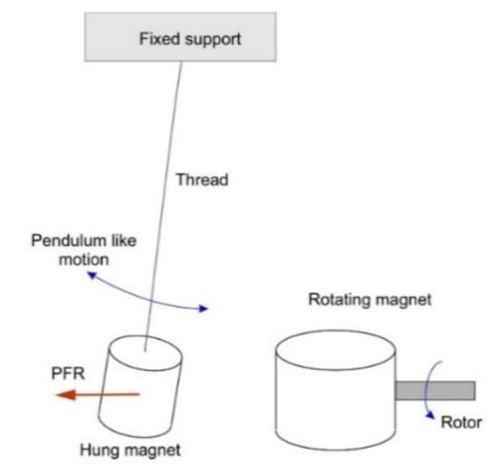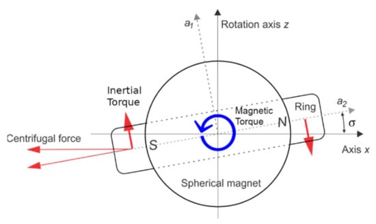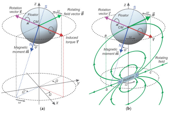(a) Motion of a free body (floator) endowed with a magnetic dipole moment subject to uniform rotating magnetic field around axis-z with angular velocity ω. Within suitable configuration parameters and initial conditions, it is expected that the floator draws a conical angular motion around the axis-z, synchronized with the rotating field. The torque experiences the floator can be calculated as . According to the model of the motion, the rotation vector of the body becomes antiparallel to torque vector which share the same unit vector with angular acceleration vector . The angle φ is the result of the dynamics and can have a constant value with suitable initial conditions. This value can be calculated according to the model (Equation (29)) and initial angular velocities using Equation (17), (t = 0). Under this conical motion, azimuthal angles of vectors can be expressed as ωT + A where . Symbol Ω denotes ωT. It is remarkable that this relation is forced by the DHM even these angles at initial condition are different. In this diagram, the torque vector is shown on the xy plane; that is, it has no z component. This is valid when azimuthal angle between B and m is zero or π. Otherwise, this component get a value proportional to sine of this angle. (b) Similar configuration but floator is exposed to inhomogeneous field of a rotating dipole (rotator) centered on axis-z. This ensures the vector B at the CM point rotates on xy plane. Here it can be seen the floator pole N deviates from the axis-z toward rotator pole N and can cause a repulsion between dipoles. It should be noted that under the inhomogeneous field of the rotator, the rotation center is not at CM since the body also involves in a translational motion on the xy plane where the CM follows a small circle around axis-z. This shifts the RC away from rotator on axis-z. Rotator’s force lines are shown on the plane defined by its dipole orientation (cb) and the axis-z. The characteristics of the motion and obtained torque do not depend on rotation direction of the rotating field.