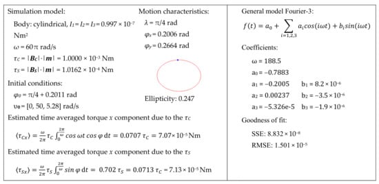 Estimation of x component of the net torque ⟨τCx⟩ due to the cyclic torque τC. In this simulation, the strength of the static torque τS is not sufficient to keep the body’s conical motion axis on z (λ = 0), but allows to find a stable equilibrium at λ = π/4. At this angle, it is expected that ⟨τCx⟩ is compensated by the average static torque ⟨τSx⟩. Calculation results support this model by providing these torque figures with a close match with an error less than 1%. The elliptical figure here shows the trajectory of the top center point of the body is seen from the direction of the axis of the conical motion. Figures on the right are Fourier analysis of the zenith angle φ obtained from the simulation (top left) of the motion which consist of harmonics with cosine terms where coefficient a0 is the angle λ and with negligible sine terms. It should be noted that only axisymmetric bodies are found to have stable motion when angle λ is not zero. In this simulation, principal moments of inertia are equal.