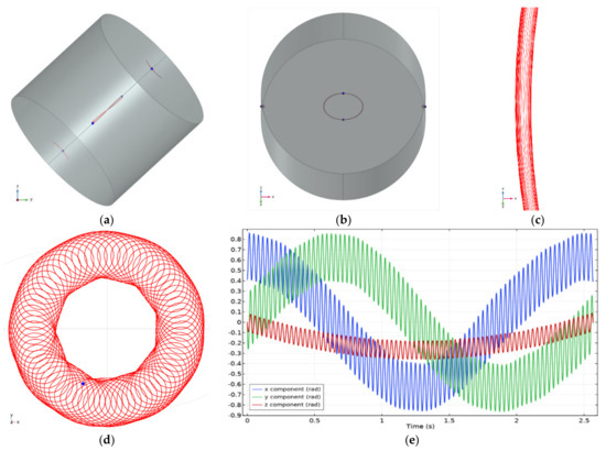 Simulations of motion of a cylindrical body with equal principal MoI where static field strength BS is below the minimum BS/BC ratio (0.158) based by Equation (51) for the body to have stable motion around the axis-z. This condition shifts the axis of the conical motion from axis-z by angle called λ and the circular angular motion becomes elliptic. In the first simulation (top figures), BS/BC is 0.0944 and the motion finds an equilibrium at λ = 0.852 rad (48.8°). Simulation run about 0.5 s and motion is found stable without any drift thanks to precise initial conditions. (a) The body shown in an instance where rotation λ is aligned with axis-x. (b) Same as (a) but with a camera angle close to λ where traces of top and bottom center points overlap. (c) Zoomed part of the elliptical trace at (b). This shows the characteristics of the stability where traces are bounded in a narrow limit. Amplitude of the elliptical motion on axes x and y are 0.186 and 0.263 rad, giving an ellipticity about 0.292. In the second simulation (bottom figures), BS/BC is 0.115 and the motion finds an equilibrium at λ = 0.64 rad. Here, an excess angular velocity of 1 rad/s on axis-y is given on initial condition to obtain the drift of the motion around axis-z in CCW direction. (d) The trace of the top center point of the body on projection to the xy plane. Here the crossed hairlines mark xy axes. This snapshot is taken at t = 2570 ms. The ring has a decagon shape (10 sides) due to nutation of the motion due to initial conditions. It is observed that the angular drift of the axis of conical motion has a small acceleration which progressively decreases and switches to deceleration at about t = 1760 ms. This non-zero acceleration is found to be a simulation artefact and vanishes when time-step is reduced from 0.4 ms to 0.2 ms. (e) Plot of orientation of the body in terms of rotations around axes x, y and z. Parameters and initial conditions of simulation 1 are: I1 = I2 = I3 = 0.999 × 10−7 Nm2, τC = 1 × 10−7 Nm, τS = 9.94 × 10−5 Nm, ω = 60 π rad/s, φ0 = −1.038 rad, = [0, −47.9, −4.891] rAd/S.