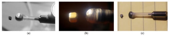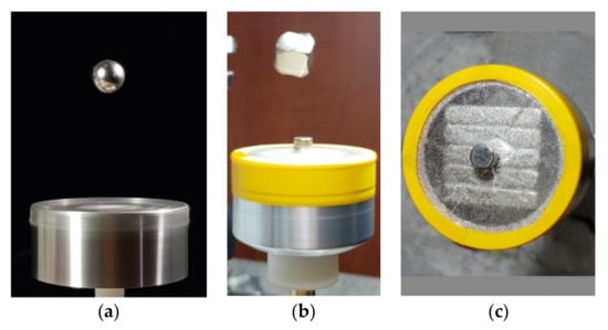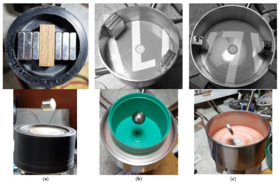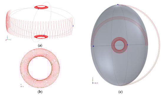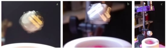(a) A simulation showing motion of a spinning cylindrical body (⌀5.245 × 9.087 mm) having magnetic moment aligned on axis-z and having uniform MoI (8.1 × 10−8 kg m2) is subject a rotating field (ω = 80 π rad/s CCW) having no z component (τC = 1 × 10−3 Nm, τS = 0). Body’s initial conditions are: φ = 0.12962 rad, = 48.71 j +122.28 k. The vector is chosen in order the body obtains a symmetric angular motion around axis-z while its spin is half of the rotating field but in the opposite direction (q = −0.5). The ribbon like trace corresponds to overlapped trajectories of middle side points (blue dots) of the cylinder. Traces of top and bottom centers are also visible as flat lines which are precise circles on the xy projection. This simulation runs about 450 ms, corresponding to 22.5 cycles of the rotating field. Simulation shows that the body obtains a symmetric angular motion around axis-z despite absence of static component of the rotating field. (b) A similar simulation where body size is ⌀7 × 5 mm, MoI’s IA = 1.4127 × 10−7, IR = 8.2654 × 10−8, υ = ω = 80 π rad/s CCW. Motion is found stable and symmetric around axis-z where angle φ is −0.5706 rad. Simulation ran for 275 ms. Trajectories of selected points (actually any point belong to the body) draw circles parallel to the xy plane since the body has a simple motion around axis-z (q = 1). (c) Motion of the same body but with different initial conditions where = −30.28 j − 373.29 k (rad/s), φ0 = 0.24337 rad and ω = 253.15 rad/s. While the motion appears stable (run time = 348 ms), the body speeds up about 0.5 rad/s during this period. Red and blue traces correspond to top and bottom centers points, respectively. In both simulations, the stability of the motion around axis-z is obtained by the spin of the body since the rotating field has no static component.