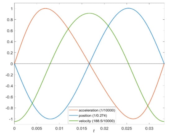 Normalized plot of azimuthal position, angular velocity and acceleration of the body over one cycle of rotating field derived from data of numerical solution 1 from
