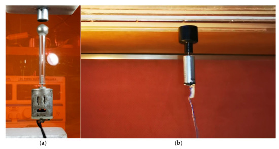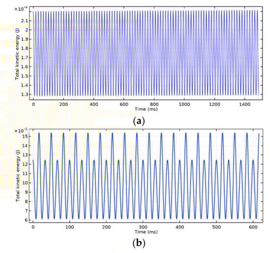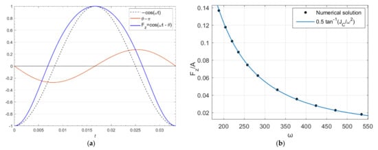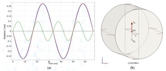 (a) Angular motion (θ) of a body around the axis-z subject to a rotating field defined in Equation (70) with velocity ω = 88.5 rad/s covering two cycles of the rotating field obtained through a simulation. The amplitude τC of the torque is 1 × 10−3 Nm. Body is a cylinder with equal MoI of 0.998 × 10−7 kg m2 endowed with a magnetic moment at CM along the cylinder axis. Body rotation is shown by the red trace having amplitude 0.2756 rad. Blue trace corresponds to a pure sine curve with amplitude 0.27565 rad and the green curve is their differences amplified by 10 times. This shows the presence of a second harmonic with an amplitude 0.03453 of the first. This fits well to the ratio (0.03475) obtained through numerical solution where body’s MoI is 1 × 10−7 kg m2 instead of 0.998 × 10−7. (b) An overview of a similar simulation where the motion of the cylindrical body is shown with red colored traces. Here, the rotating field axis, body rotation axis and torque vector are aligned with the axis-z. The torque vector is shown at instances T0 and T1 near to the half cycle of the rotating field.
