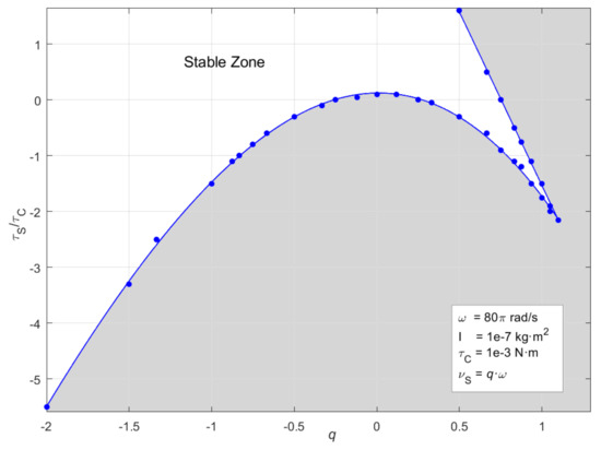 Dependence of the motion stability of a rotating body subject a rotating torque to the body spin and to the static component of the torque for a configuration where the body is a homogeneous cylindrical object having equal principal MoI equal to 1 × 10−7 Nm2. The rotating torque assumed be obtained by a homogeneous rotating magnetic field around axis-z with an angular velocity 80 π rad/s interacting with the magnetic moment of the body centered at origin. This torque is defined by cyclic and static torque coefficients τC and τS. This chart is obtained by running the simulation for various values of parameter τS and body spin velocity υS which are presented by parameter q corresponding to ratio υS /ω. Each data point on the curve which separates stable and unstable zones correspond to parameter pairs providing stable motion. These stable data points are paired with unstable data points at proximity but residing in the unstable region (not shown). This chart only covers cases where the angular motion of the body is in the opposite phase of the driving field, conforming the PFR scheme. There are also cases where body motion is stable but in the same phase of the rotating field where parameter q is greater than one. These cases also cover negative τS values. The parabolic part of the curve fits to a polynomial function of third degree with R-square better than 0.999 where coefficients A0 to A3 are (0.12, 0.04, −1.72, −0.17).