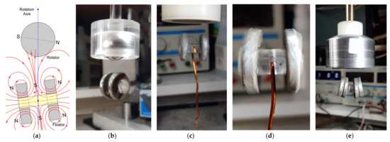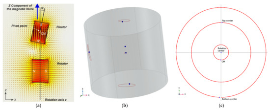 (a) A visualization of magnetic field and alignment of the floator in the interaction with the rotator in a basic configuration shown on the plane where magnetic moments lies. Due to the synchronized angular motion of the floator with the rotator rotation, this alignment is constant while this plane rotates around axis-z. The floator angular motion is accompanied with a translational motion since the rotator field also induce a force. These combined motions cause the floator’s rotation center (denoted as pivot point) to shift in z direction. In this alignment, floator’s N pole is always held toward rotator’s N pole and cause a steady repulsion in +z direction. Here, it can be also seen that effects of the angle φ and the shift of the floator’s CM (CM coincides by its magnetic moment) add up on this repulsion force. The motion of floator is called conical motion and the angle φ is retained all the time when the motion is have axis-z symmetry. This instance corresponds to ωt = π/2 of Equation (30), with reversed mAgneTIC poleS And to angle γ = 0. (b,c) Simulation result of a configuration similar to (a) where floator and rotator magnetic models are approximated as point dipoles. On this configuration, rotator is tilted around axis-y with a relatively large angle γ about 0.159 rad (9°), which induce a static field component (BS in direction of axis-z), corresponding to ratio BS/BC equal to 0.16 according to Equation (32). This ratio is above the minimum ratio 0.107 (Equation (51)) to keep the axis of the conical motion on axis-z Floator’s conical motion is characterized by angle φ equal to 0.2154 rad and by upward shift of the RC by 0.964 mm from CM. This shift can be seen also in these figures where CM circles around axis-z and by circle of bottom center point being larger than of the top center point. Rotating field velocity is 60 π rAd/s and torque coefficients τC and τS are 7.5 × 10−4 and 1.2 × 10−4 Nm, respectively. Body has equal principal moments of inertia as 0.999 × 10−8 kg m2. Initial angular velocity vector of the body for obtaining this motion is ωF = 0.0045 I + 40.295 j + 4.355 k rad/s. The simulation ran about 683 ms. Since the position and orientation of the floator’s magnetic moment is constant in a co-rotating reference frame with the field, torque and force received from the field are also constant.