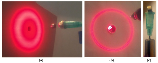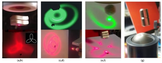 d) A tiny 1/8” cube magnet trapped in air in a position along axis of a rotation of a small magnet visible at right edge of the image and the reflection of laser beam emanating from the small hole on the screen reflected back from a face of the cube belong a pole. The pattern consists of one outer and two overlapping inner loops. On the center images, trapped magnets and their angular oscillations can be seen. They gave both single inner loops, large on the left image and point like on the right. At image (