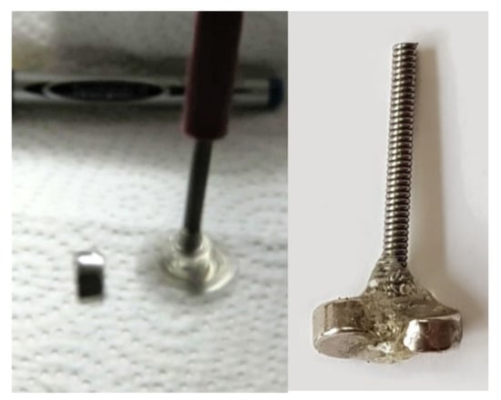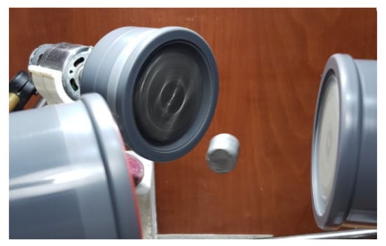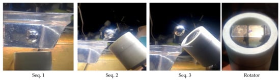 Sequences from a test about capturing a spherical dipole magnet (⌀15 mm) by a rotating dipole magnet assembly from a container filled with water, initially staying at the bottom, raising it and taking out without making contact with the container. The rotating assembly consists of two stacked 1/2” cube magnets grade N50 having dipoles aligned to the rotation plane, placed asymmetrically with respect to the rotation axis inside a plastic cylindrical housing having ⌀29.6 mm inner diameter as shown on the right picture. The small circle in violet color on the right magnet marks the rotation axis. The attraction factor is obtained solely by this offset in this configuration since the dipole of these stacked magnets lies on the rotation plane.