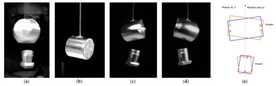 Complex angular motions of floators involving large variations of angle φ while they spin around their dipole axes. Floator is a stack of two square 10 × 10 × 3 and one ⌀9.5 × 1 magnets. This setup includes an overhead magnet assembly consisting of a stack of two ⌀10 × 10, visible on the top of (c) which allows complex motions of trapped magnets. Pictures covers a frame about 1/30 s where the floators perform several cycles of motion in this time window. Floators can ever reach to larger variations of φ by increasing the rotation speed of the motor. Dimensions are in mm.