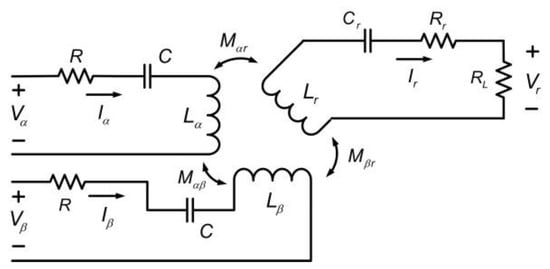 The equivalent circuit of the inductive 2D WPT system with the resonant capacitors can be represented as shown in Figure 2 [,,,], where the inductive coupling between two Tx coils is neglected under the assumption that two coils are orthogonal.