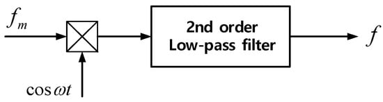 Figure 7 shows the block diagram of the demodulator, where fm means the measured signals of the voltage and current modulated with cosωt. The carrier frequency is given as 530 kHz, which is the same as the frequency of the input voltage and current. The second-order low-pass filter with a cut-off frequency of 10 kHz is used to extract the envelope of the voltages and currents of the Tx coils, which is a trade-off between the filtering performance and control loop dynamics.