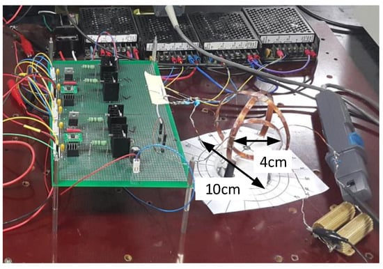 In order to verify the operation of the proposed estimator, the design example is provided. The parameters of the coils and circuits used in the design are given in Table 1. The diameters of Tx and Rx coils are a = 10 cm and b = 4 cm, respectively. The measured coil parameters including the resistance and inductance are shown in Table 1. As the 2D WPT system considered in this paper is designed to be operated at a frequency range of 500 kHz, the value of the series capacitor C of each Tx circuit is chosen as 10 nF. Thus, the resonant frequency of the Tx circuit is 530 kHz. The series capacitor Cr of the Rx circuit is selected as 20 nF for matching to the resonant frequency.