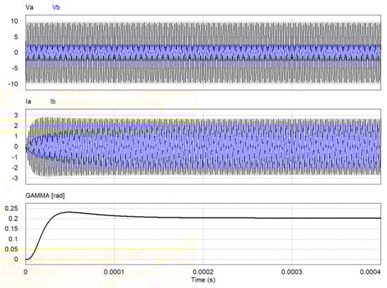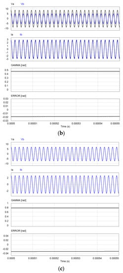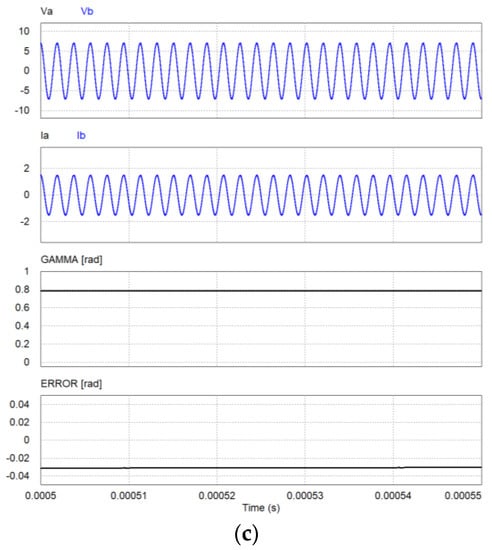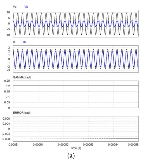 Figure 12 and Figure 13 show the simulation results for the steady-state response of the proposed estimator for the physical angles Φ of 15°, 30°, and 45° when d = 0 and 2 cm, where the voltages, currents of the Tx coils, estimated mutual inductance angle, and estimation error are shown, respectively. The estimated mutual inductance angles are shown as 11.64°, 26.79°, and 45.21° (0.203, 0.468, and 0.789 radians) for d = 0 cm, and 23.59° and 36.49°, and 45.19° (0.412, 0.637, and 0.789 radians) for d = 2 cm, respectively. It is known in these results and Table 2 that the mutual inductance angle can be estimated using the voltages and currents of the Tx coils in the proposed estimator.