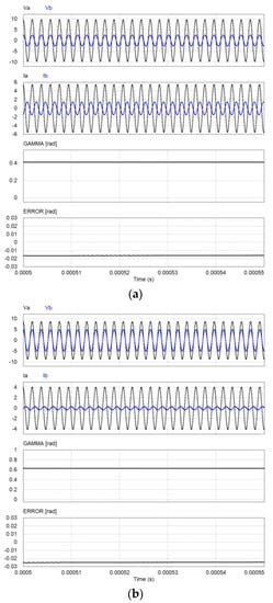 For a small error, Equation (14) can be approximated as . It is noted in this equation that the mutual inductance angle can be estimated if the tracking control loop causes the error to be zero. Figure 6 shows the concept of the estimation for the mutual inductance angle using the proposed method. It is known in this figure that the estimated angle is aligned to the actual value as when .