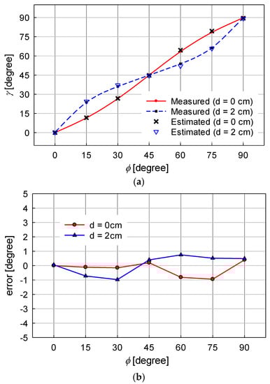 Figure 14 shows the experimental results for the proposed estimator for various physical angles. Figure 13a shows the measured and estimated mutual inductance angles and Figure 13b shows the estimation error, where the measured values are from Table 2. The maximum error is 0.97° at Φ = 30° and d = 2 cm. It is known in the experimental results that the mutual inductance angle can be estimated with an error of less than 1° using the proposed estimator in the experimental WPT system.