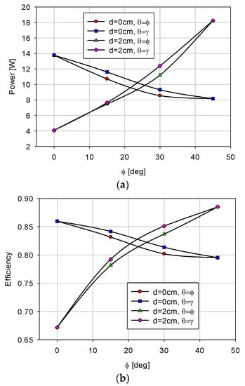 where the reference voltages are given as Id = 3 A and Iq = 0 for the experiment. The load resistance is given as RL = 10 Ω. Figure 15 shows the experimental results for the 2D WPT system when the physical angle is Φ = 30° and d = 0 cm between the Tx and Rx coils. Figure 14a,b show the input and output currents when and , respectively. The output powers of both cases are calculated as 8.56 W and 9.32 W, respectively, where the PTEs are 80.2% and 81.4%, respectively. Figure 16 shows the results for Φ = 30° and d = 2 cm. The output powers and PTEs are 11.2 W and 12.4 W, and 83.7% and 84.9% for and , respectively. The output power and PTE of the 2D WPT system for various physical angles are shown in Figure 17. It is noted in these results that the power transferred to the Rx coil and PTE is improved when the estimated mutual inductance angle is applied instead of the physical angle.