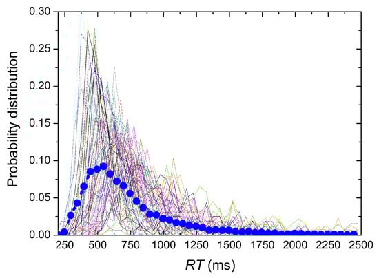 Computer-based experiments were carried out using the Window program DMDX [29] widely used in the community of experimental and cognitive psychologists [16,18,19,24,29,30,31]. Using this program, stimuli were presented to the participants and RTs recorded. The tasks applied in this work correspond to the child version of the Attentional Network Test (ANT Child) [32]. The ANT Child is a task designed to test three attentional networks (alerting, orienting, and executive control) [33] in children with a child-friendly version of the flanker task with alerting and orienting cues. The alerting network is assessed by changes in reaction time as a result of a warning signal. Orienting is related to changes in the RT indicating where the target will take place. Finally, the efficiency of the executive control is tested by asking the children to answer by pressing the keys in indicating left or right direction of an image placed at the centre in between neutral, congruous or incongruous flankers. These three networks are related among themselves [34,35]. During the experiment, each child was sitting in a separate and quiet place so that the independence among children while performing the experiment was guaranteed. Laptops bearing DMDX software were used. The stimuli were presented randomly to avoid order presentation effects. In this type of experiments, the individual reaction times take place in a very short period of time, typically within a few hundred milliseconds (70–2500 ms). The visual stimuli were very simple and uncorrelated to any cultural background or educational training. Specifically, each stimulus consisted of 5 fish aligned horizontally looking to the right or the left. The colour was black and the background was white. The objective of the task was to identify, in each trial, the direction of the central fish. There were three cases depending on the orientation of the fish around the central one. The neutral case was when there was only the central fish. The congruent case was where the surrounding fish were placed in the same direction as the central fish. The third case was where the surrounding fish were placed in the opposite direction with respect to the central one. If the central fish was facing right, the key labelled “M” should be pressed; if not, the key labelled “Z” should be pressed. A total of 144 stimuli were presented in a random way and for a maximum of 2500 ms (maximum duration of a trial) or until the child pressed a key. The maximum duration of an experiment can be calculated as ms = 6 min. This situation is only given when the participant does not respond to any of the visual stimuli which is a very unlikely situation. Overall, our experiments involved 144 × 168 = 24,192 reaction times. Figure 1 shows the probability distribution curves of the reaction times for each individual along with the average over all participants and the most likely value of the mean curve peaks around 550 ms.