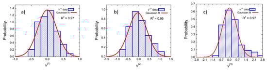 The components of are to be distributed normally, that is, they obey a Gaussian distribution over the ensemble of N individuals which are shown in Figure 2 where the panels (a–c) exhibit this property explicitly. At the 0.05 confidence level, the data of the three moments were found to be significantly drawn from a normally distributed data according to the Kolmogorov-Smirnov normality test [37]. Therefore, the sample size used in this work () is enough to show the Gaussian behaviour of the distributions of , , and . In fact, when we randomly choose a sample of 50 individuals out of 168, the percentage of relative errors among the respective variances of , , and are within 3.6 %. The fittings in Figure 2 were carried out by using the non-linear fitting algorithm of Levenberg-Marquardt [38,39].