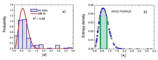 Here, N is the number of individuals in the sample, and is the probability associated to the i-th individual given by . Apart from physics, entropy is also an analysis tool in a variety of fields [41,42,43,44], for example, in psychology it is widely used to analyse cognition experiments [41,42]. The panel (a) of Figure 3 shows the fit of the MB distribution Equation (7) to all the RT experimental data for which () and in panel (b) we show the entropy density curve. The Gaussian behaviour of the distributions of , , and leads to a Maxwell–Boltzmann distribution of , even if in our case, the variances of the three components are not all equal [40]. As already mentioned, we have obtained a coefficient of determination of using experimental reaction times. Figure 3, panel (b) shows the entropy density curve for the experimental data of this work.