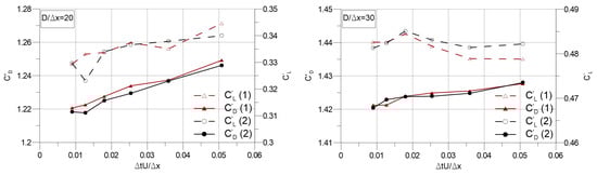 Mean drag and lift coefficients versus dimensionless time step size.
