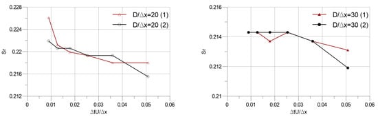 Strouhal number versus dimensionless time step size.